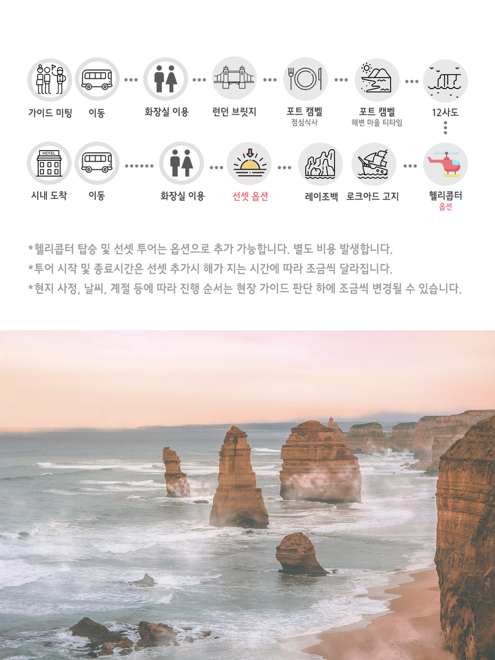 많은 분들께서 알고계신 바와 다르게 내륙 코스를 통해 그레이트 오션로드에 가시더라도 해안 도로와 숲길을 만나게 됩니다. 단지 처음부터 해안 도로를 통해 구불 구불한 길을 달리는 것이 아닌 효율적인 코스 설정을 통해 Port Campbell 포트캠벨 마을로 고속도로를 통해 바로 진입후, 12사도를 비롯한 세계적인 명소들을 해안 도로 이동을 통해 감상하시게 됩니다. 오랜 시간 차량 탑승을 꺼리시는 분들께서 선호하시는 내륙 코스는 해안 도로 코스에 비해 차량 탑승 시간을 절반 가까이 줄이실 수 있으며 그 시간 만큼 황홀한 명소들을 조금 더 찬찬히 오래도록 감상하실 수 있다는 장점이 있습니다.