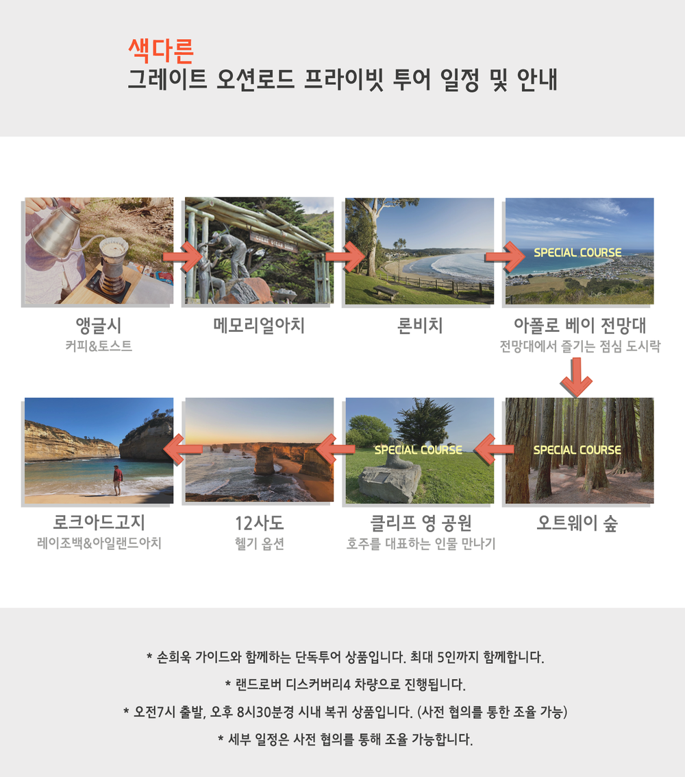 한 가족, 한 일행 만을 위해 손희욱 지식가이드가 함께하는 상품입니다. 기존 그레이트 오션로드 해안도로 코스에서 가지 않는 장소들을 포함하고 있습니다.