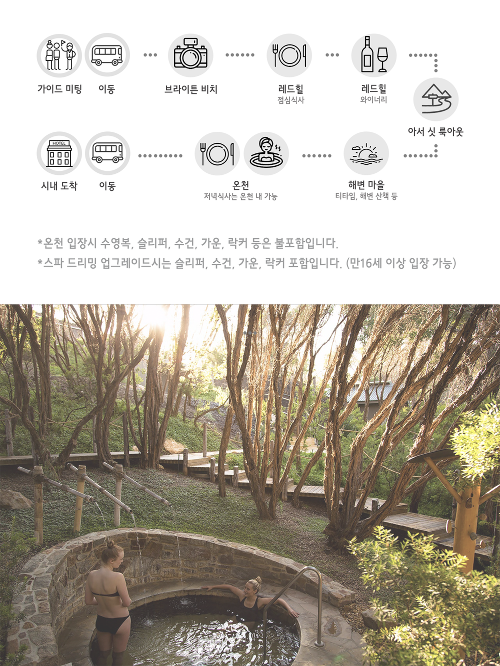 예쁜 비치박스에 들러 인생 사진을 남긴 후 바베큐, 와이너리에서의 테이스팅, 바다가 보이는 아름다운 카페에서 따뜻한 커피 한 잔 등을 통해 여러분의 힐링은 계속됩니다. 저녁에는 산 꼭대기 노천탕에서 저무는 해를 바라보며 낭만을 즐기신 후 쏟아질듯 별이 가득한 하늘 아래서 즐기는 숲속 온천으로 잊지 못할 추억을 만드실 수 있습니다.