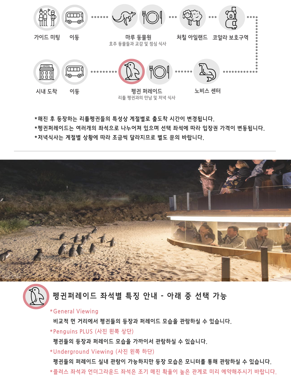 필립아일랜드는 사람이 아닌 그 곳에 살고 있는 동물들과 자연이 주인인 곳입니다. 하나의 자연공원으로 이루어진 필립섬에서의 특별한 하루 중 호주에만 사는 다양한 동물들, 그리고 필립아일랜드의 주인공인 작고 귀여운 리틀펭귄들의 귀환 여정을 만나보세요. 필립아일랜드는 오후 출발 속성 일정과 오전 출발 종일 일정 두 가지 프로그램으로 나누어 운영하고 있습니다.