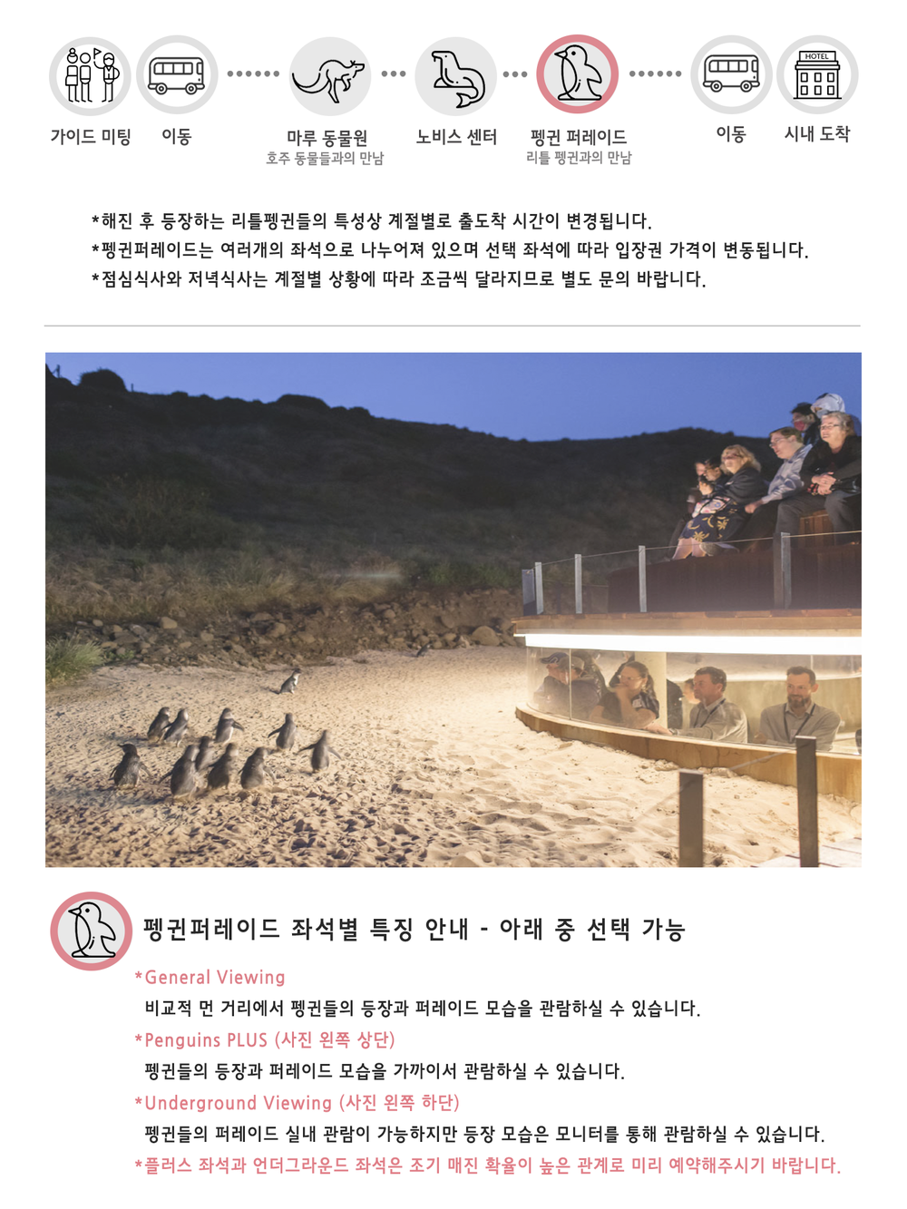 필립아일랜드는 사람이 아닌 그 곳에 살고 있는 동물들과 자연이 주인인 곳입니다. 하나의 자연공원으로 이루어진 필립섬에서의 특별한 하루 중 호주에만 사는 다양한 동물들, 그리고 필립아일랜드의 주인공인 작고 귀여운 리틀펭귄들의 귀환 여정을 만나보세요. 필립아일랜드는 오후 출발 속성 일정과 오전 출발 종일 일정 두 가지 프로그램으로 나누어 운영하고 있습니다.