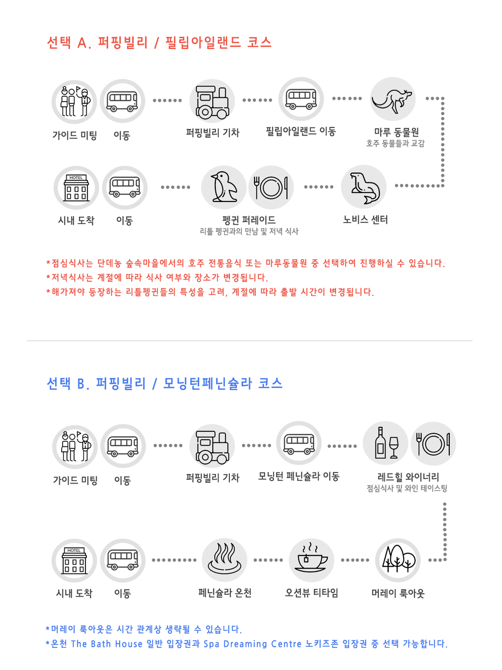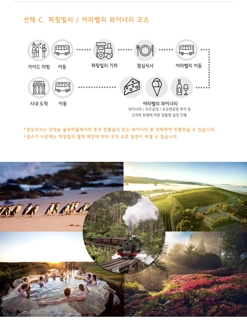 애니메이션 토마스와 친구들의 본모습으로 유명한 퍼핑빌리 열차는 멜번 여행지 중 꼭 가볼만한 곳으로 알려진 곳입니다. 오전 또는 오후 중 1시간 정도 열차를 탑승하신 후 오후에는 필립아일랜드 / 모닝턴 페닌슐라 / 야라밸리 와이너리 등 고객님께서 선택한 두번째 여행지로 이동, 하루에 두개의 여행지를 즐기실 수 있는 일정을 구성하였습니다.