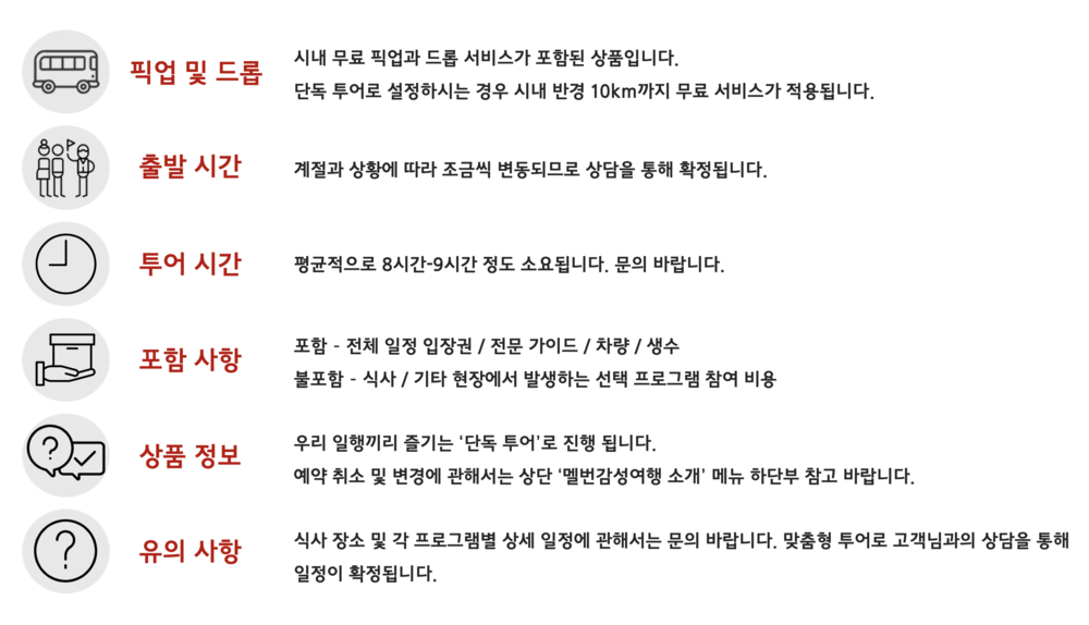 한 가족, 한 일행만을 위해 멜번감성 여행만의 최고급 차량과 서비스로 준비된 투어 상품입니다. 누워 이동이 가능한 최고급 리무진형 미니밴으로 여러분의 여행을 좀 더 특별하게 즐겨보세요.