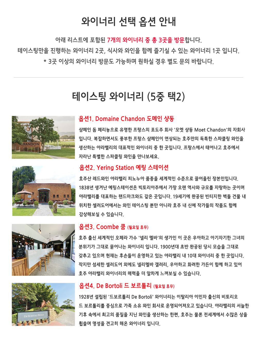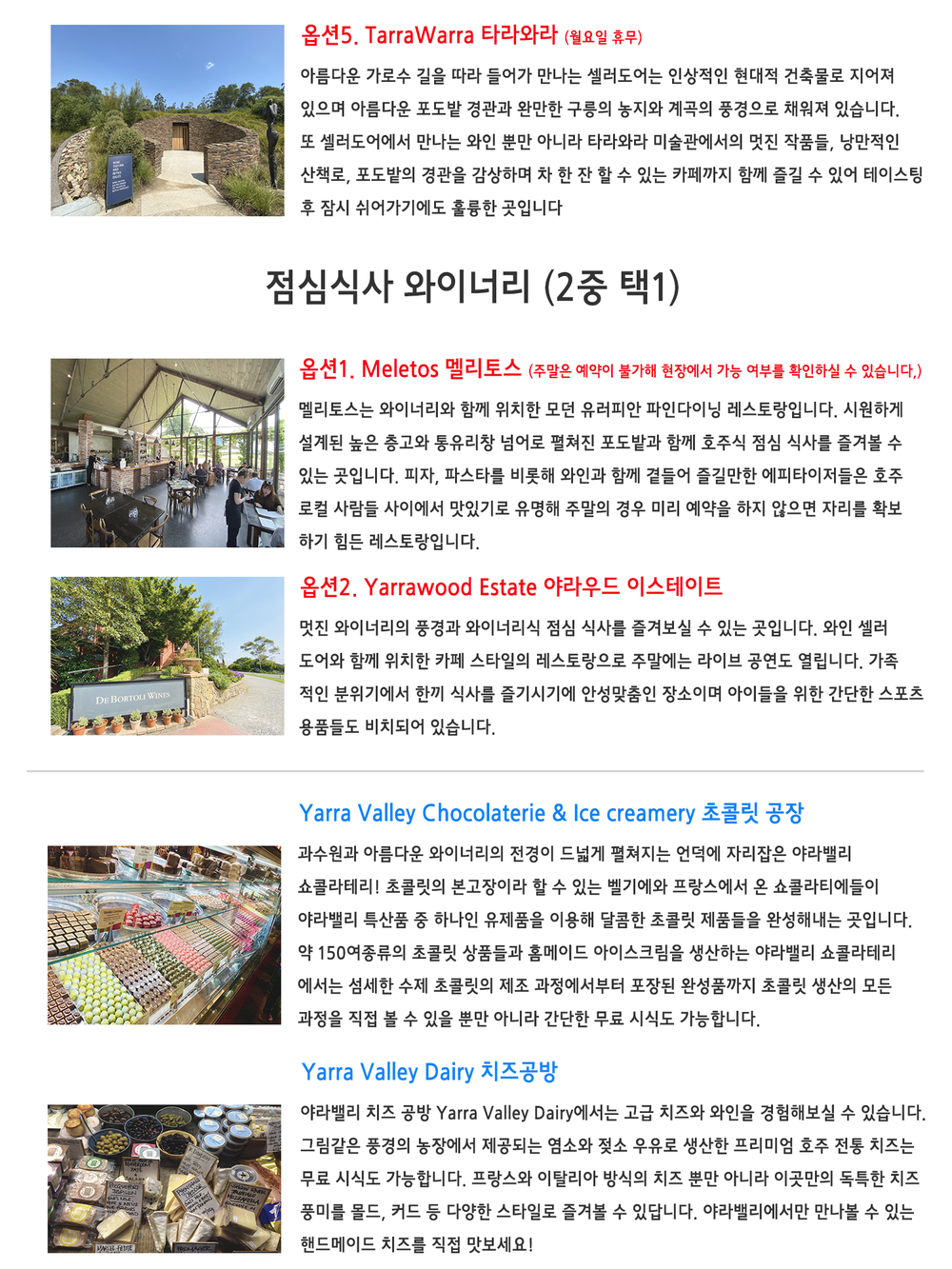 매 주말, 아이들과 함께 와이너리에서 가벼운 고급 와인 한 잔과 맛있는 요리를 먹기 위해 야라밸리로 향하는 호주 로컬 가족들의 분위기를 그대로 느껴보고 싶으신 분, 또는 호주 와인만의 개성이 잘 묻어나는 실험적이지만 그 맛과 향을 세계적으로 인정받는 최고의 와이너리들을 방문해보시고 싶으신 분 등 한국인에게는 아직 친숙하지 않은 독특한 추억을 만들고 싶으신 분들께서 선택하시는 투어입니다. 와이너리 뿐만 아니라 초코렛 공장, 치즈 공방, 아이들이 뛰어 놀기 좋은 넓은 포도밭 등 어른들만을 위한 일정이 아닌 온 가족이 즐길 수 있는 맞춤형 일정으로 진행하고 있습니다.