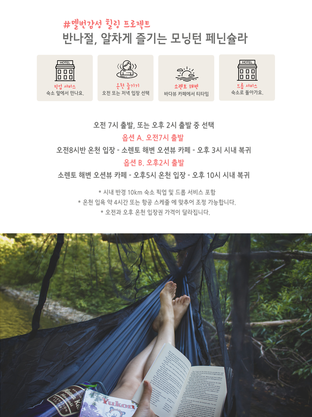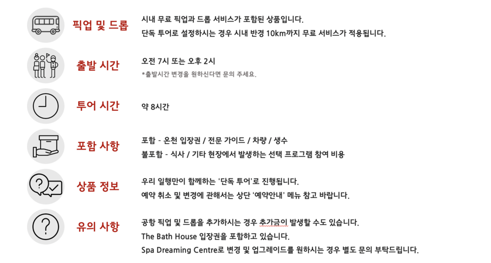 너무 긴 시간 투어가 부담스러우신 분, 이미 모닝턴 페닌슐라를 다녀오셔서 다른것 보다도 온천에 더 많은 시간을 할애해 잠시 쉬었다 오고 싶으신 분들에게 추천드려요. 또 오전 일찍 멜번에 도착하시거나 밤 늦은 시간 비행 스케줄이 있으신 분들께서도 공항 픽업 및 드롭을 포함해 이용하실 수 있는 프로그램입니다.