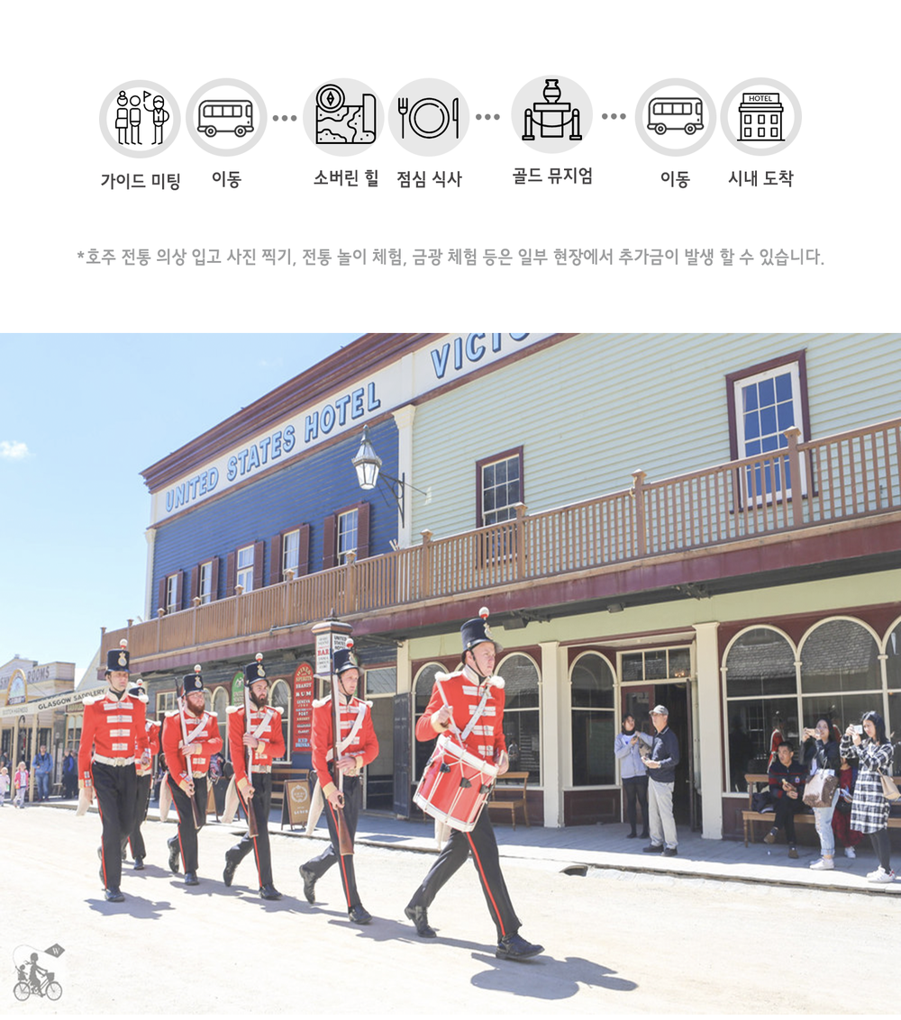 1850년대로 떠나는 시간 여행, 당시 골드 러시로 인해 부유했던 도시의 모습을 그대로 재현해둔 곳입니다. 멜번의 역사와 다양한 과거의 체험을 통해 빅토리안 시대로 돌아가보세요. 호주 최대 민속촌 소버린 힐은 호주 역사에 관련된 다양한 배경 지식과 함께할 때 더 많은 것을 보고 즐길 수 있도록 설계되어있습니다. 또한, 소버린 힐 내부에서 구경하고 체험 할만한 요소들이 시간대별로 나뉘어져 있어 전문 가이드의 경험과 지식은 필수 요소입니다.